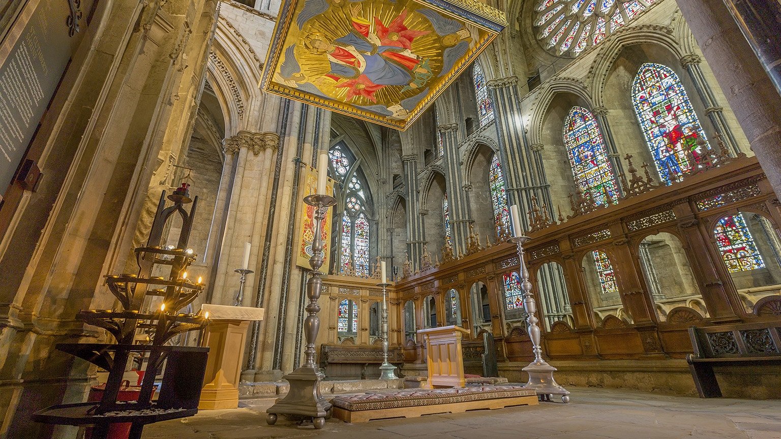 With St Cuthbert’s shrine as well as a treasure museum, this Norman C of E church is architecturally inventive.